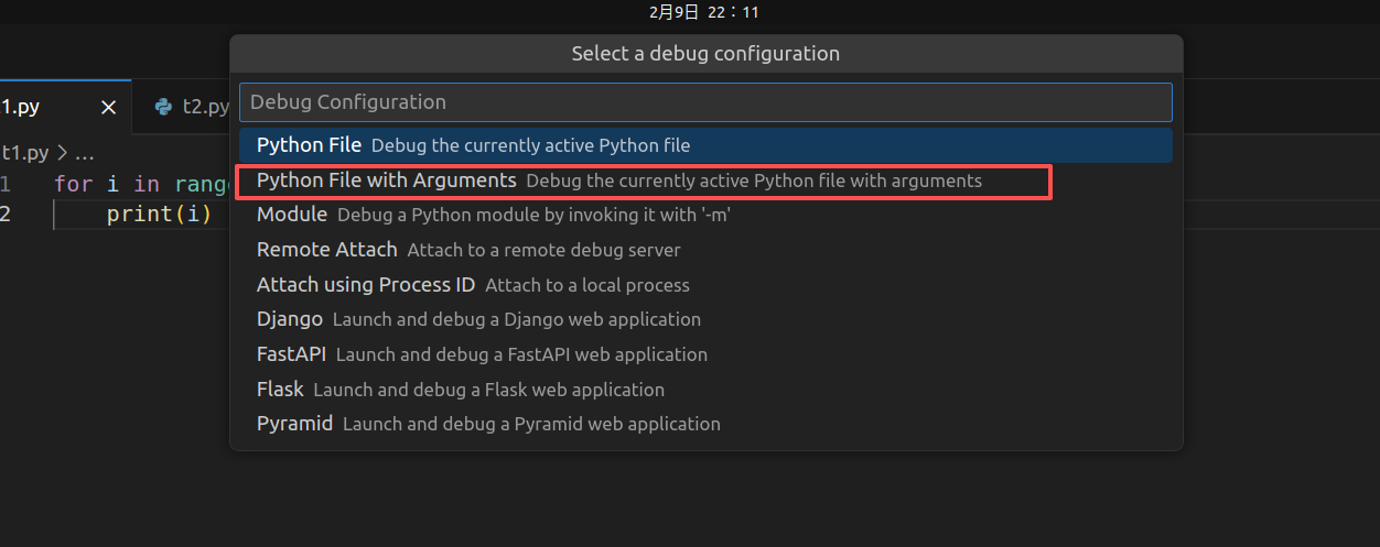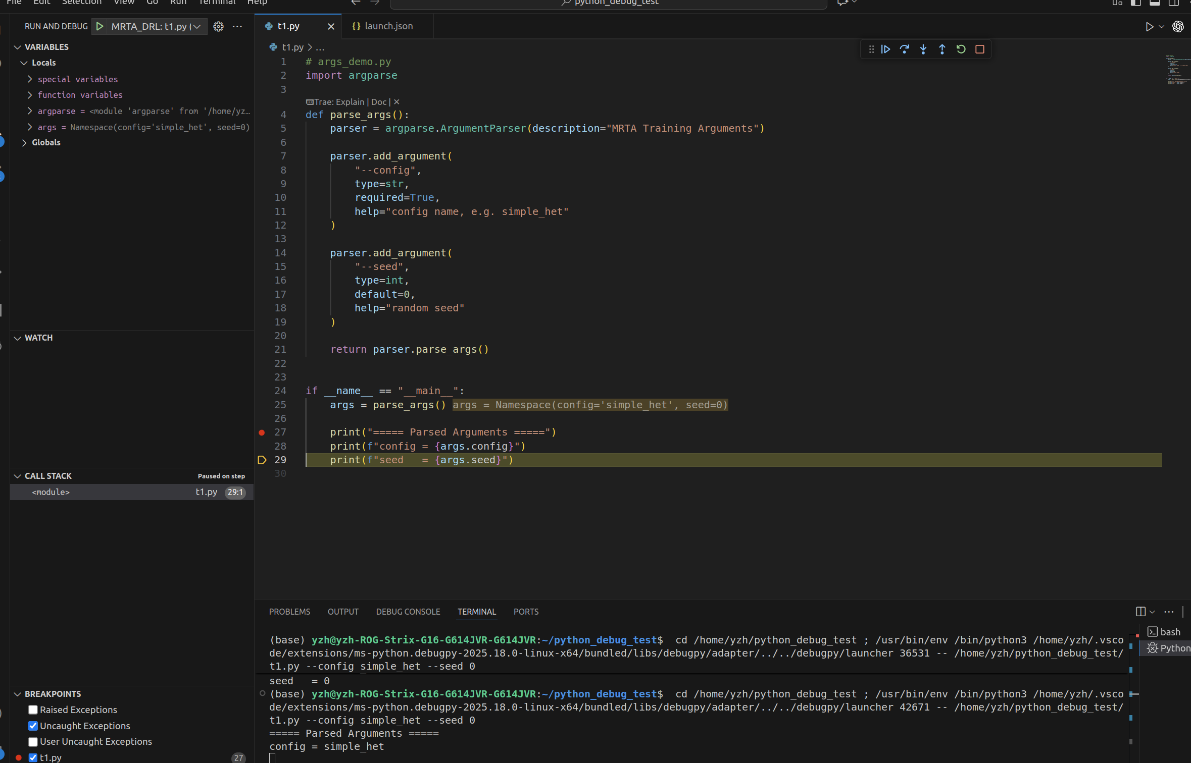 t1.py的代码如下。可以看出--config这个参数是必须的,但是我可以直接运行这个程序。快捷键就是ctrl+F5。