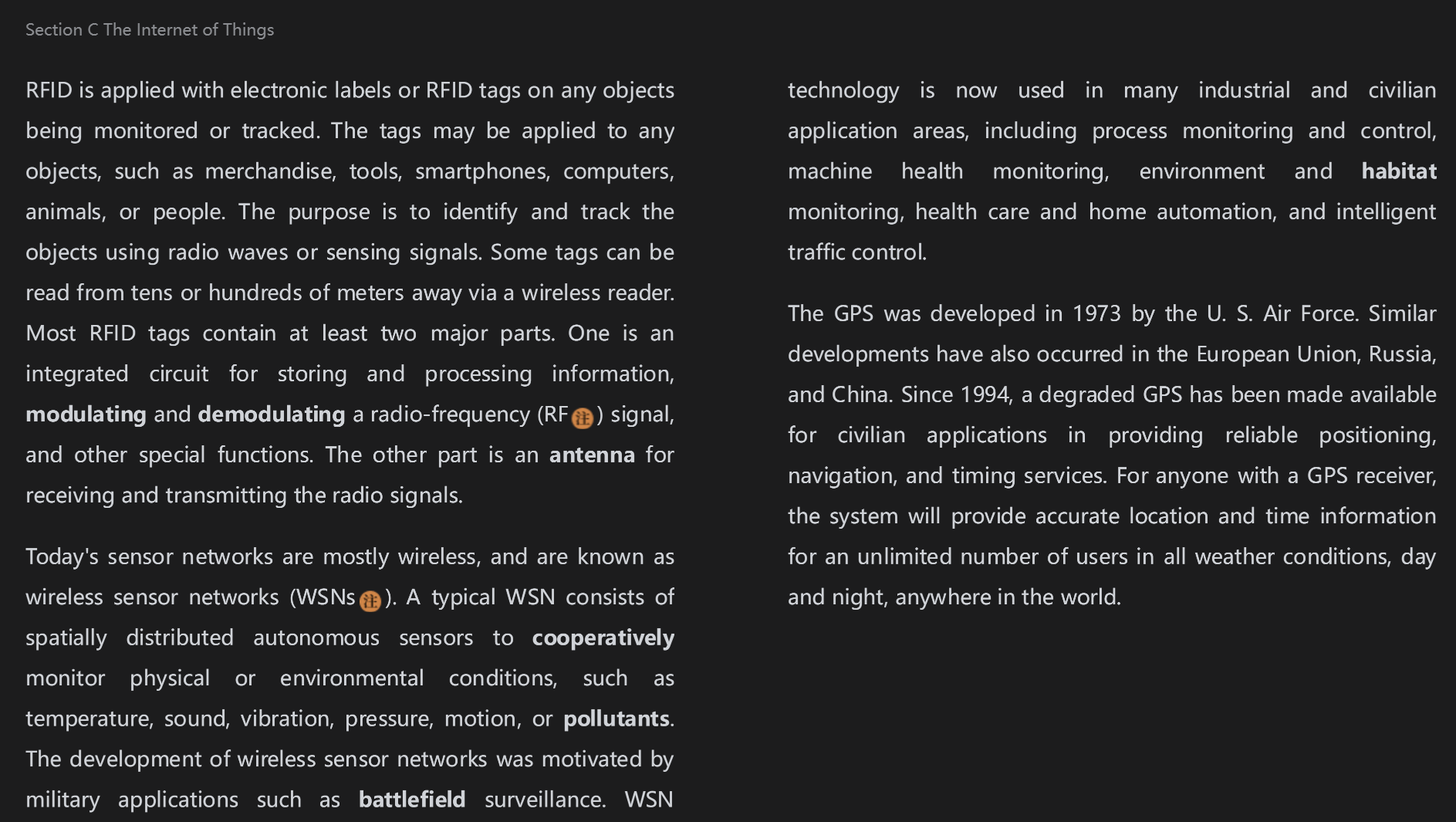RFID和电子标签或RFID标签一起应用在任意物品被监视或追踪时。这个标签可能应用在任何物品上,例如商品,工具,智能手机,电脑,动物或者人。这个目的是用无线电波或传感信号确认和追踪物品。一些标签可以通过无线阅读器从几十米或者几百米外被读。大多数RFID标签包含至少两个主要部分。一个是集成电路,为了存储和处理信号的,调制和解调射频(RF)信号和其他功能。另一部分是天线,为了接收和发送无线电信号。