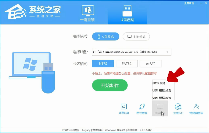 选择【U 盘模式】,如果你的电脑有多个 U 盘设备,记得检查一下当前名称是不是需要制作设备的名称。