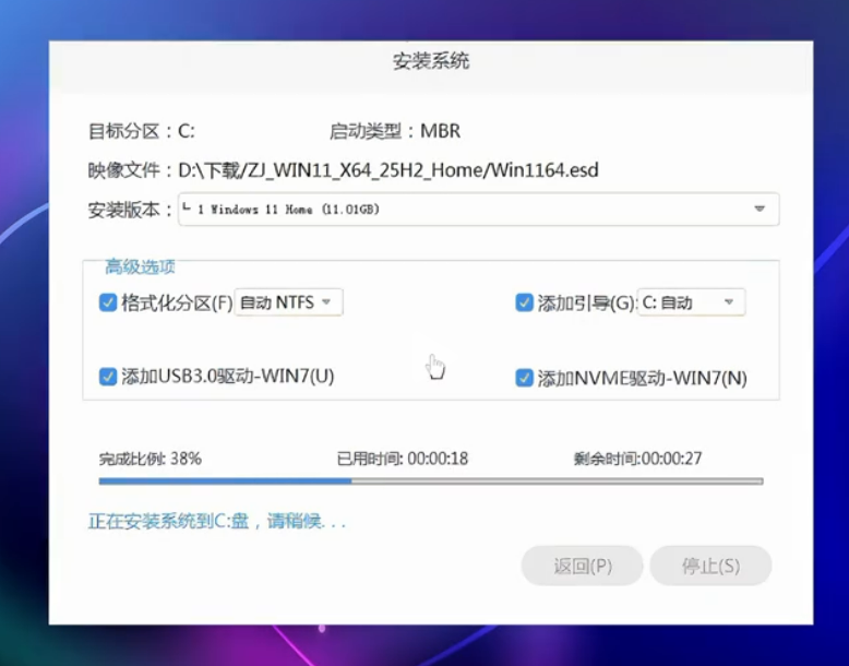 系统写入完成重启,就会进入安装界面,展开驱动及相关的部署,这个过程也不要去操作或强制中断,耐心等待即可。看到这个页面就点击下一步。