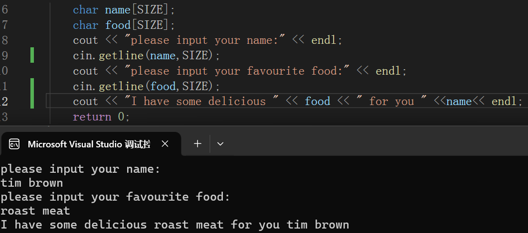 可以看到,getline调用的方式和结构很像,都是用"."串联两个部分,()中填写的是上面的name数组以及长度。在使用getline之后,很明显可以将多个单词同时输入了,这是因为getline每次读取一行,并将键盘输入的换行符作为结尾判定,但并不会保留换行符,这样即使下面仍然有cin输入,cin也不会接收到缓冲的换行符从而停止输入。