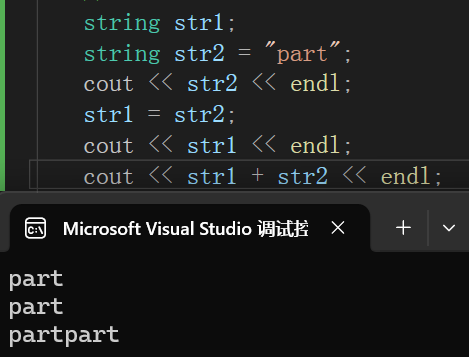 在包含string文件后,string类对象在声明时可作为简单变量,初始化方式和普通变量也没有太大差别,如下图: