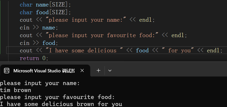 可以看到,当输入name时,明明有两个单词,并且下面还要输入food,但是执行时直接跳过了输入food的操作,转而将名字的第二个单词当作food进行了输出。
