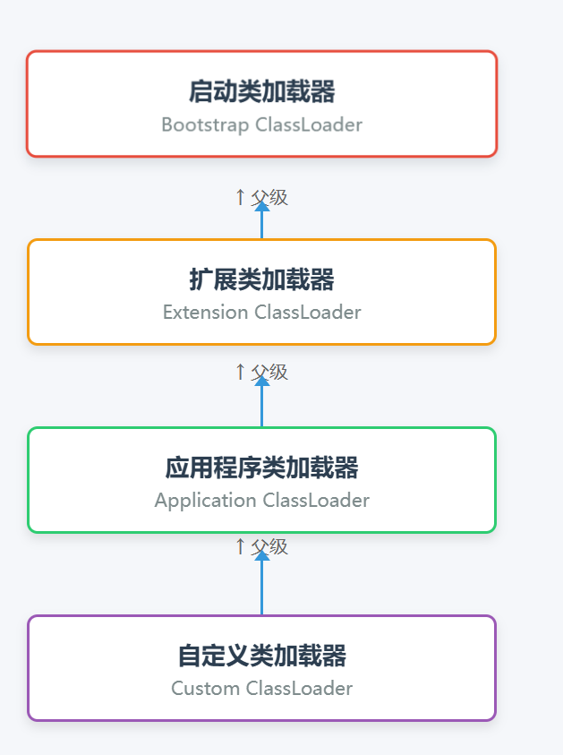 - 核心层级(自上而下):启动类加载器 → 扩展类加载器 → 应用程序类加载器;