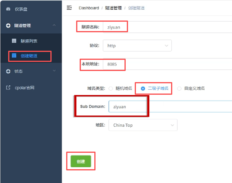 - 隧道名称:可自定义,本例使用了: ziyuan 注意不要与已有的隧道名称重复