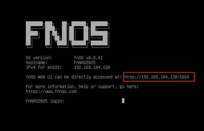 启动fnOS系统后,能看到Web UI管理界面的地址:http://192.168.184.130:5666 在浏览器中打开: