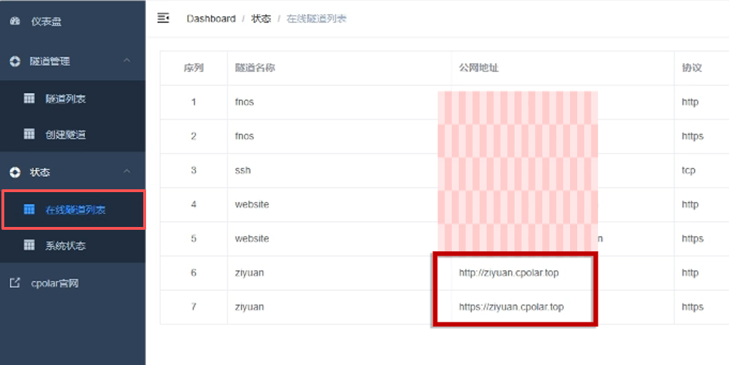 点击创建,创建成功后点击状态,选择在线隧道列表,这里能看到我们成功生成了2个固定的公网地址,名称好看又好记。