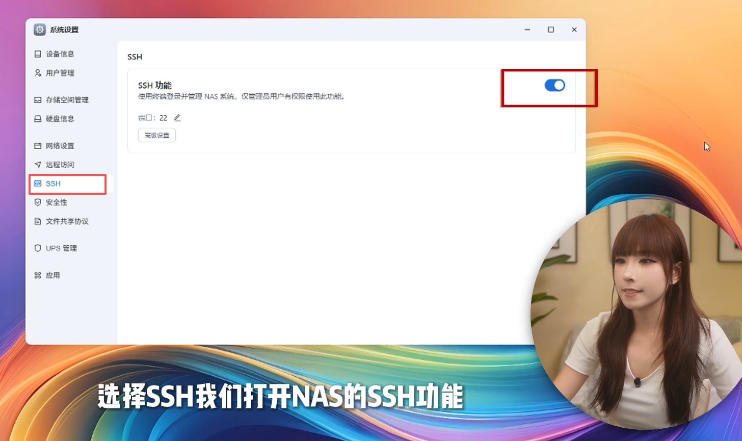 确认docker已经就位后,点击设置,选择ssh,我们打开nas的ssh功能,