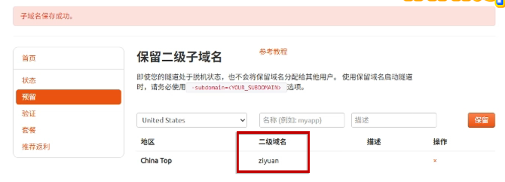 我们来登录cpolar官网,点击预留,选择保留二级子域名。地区选择china top 名称自定义,点击保留。