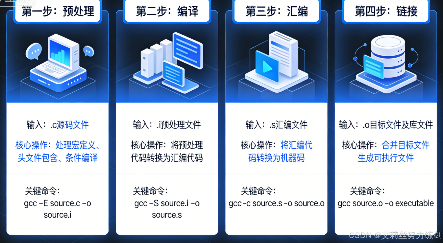 核心结论:所有.c/.cpp源码生成可执行文件,必须经过4步,前3步针对单个源码,第4步关联所有依赖。