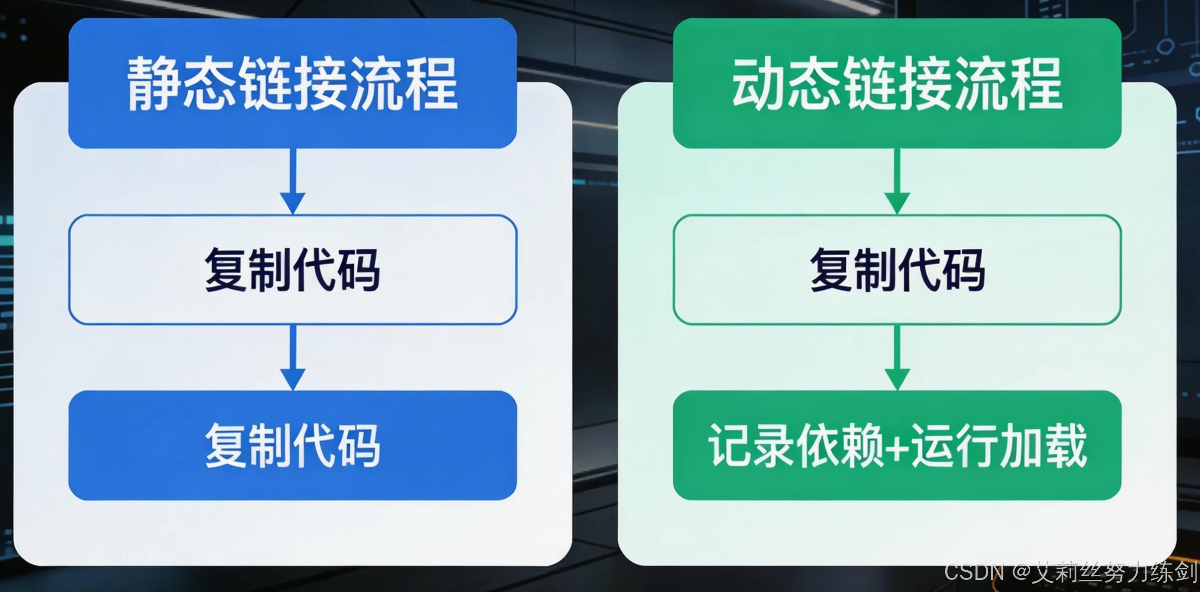 │ │ ├── 动态链接2步:编译链接(记录依赖)→运行加载(解析重定位)