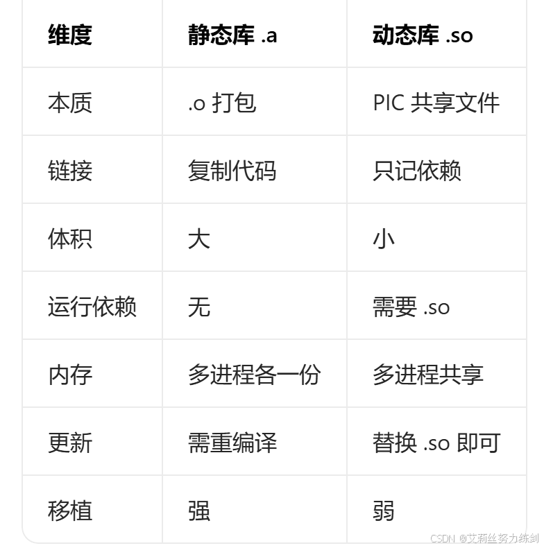 静态库(.a):.o归档包,静态链接,可独立运行;动态库(.so):PIC编译,动态链接,多进程共享