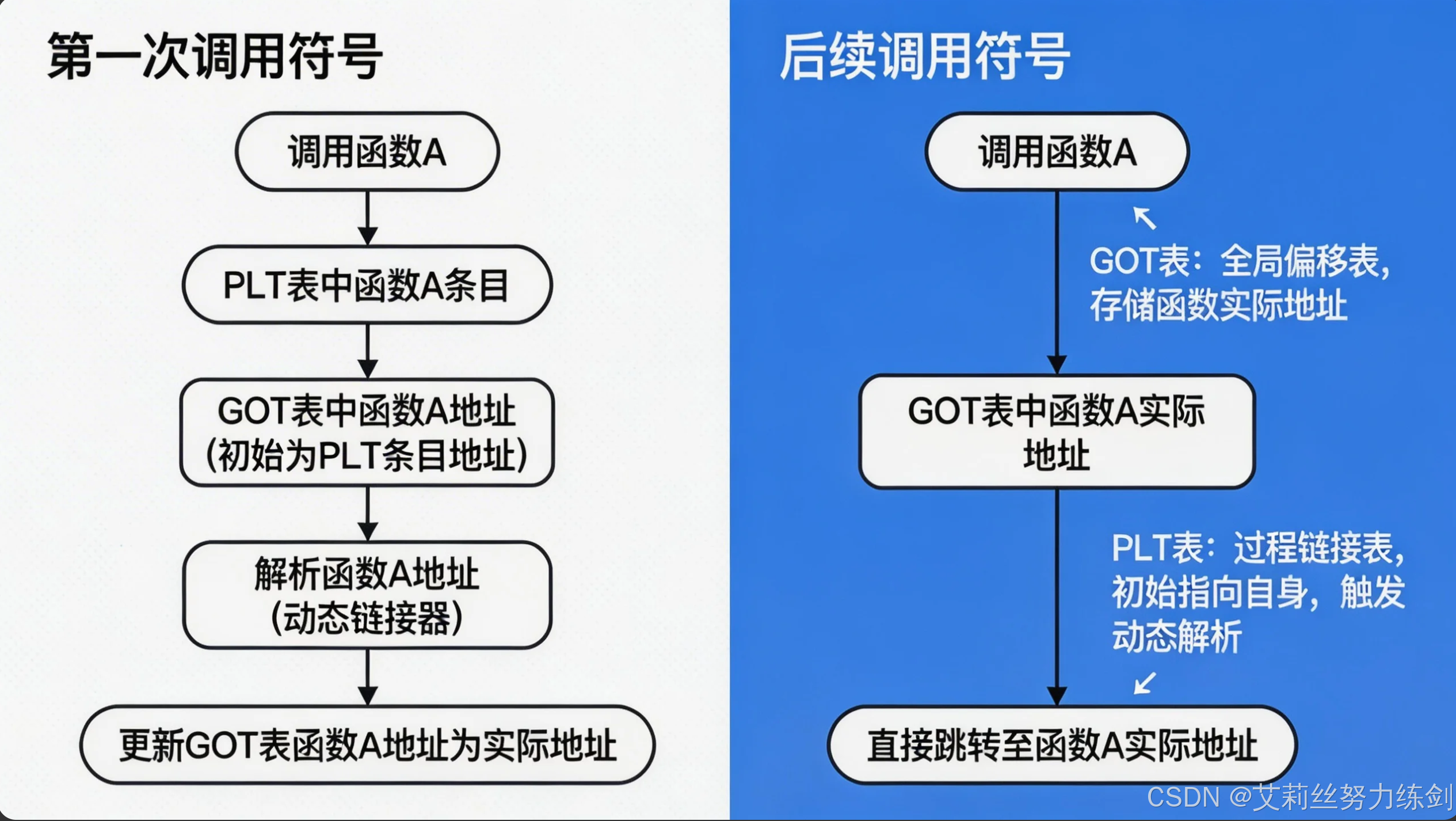 │ │ ├── GOT(全局偏移量表):存储符号最终地址,第一次调用填充