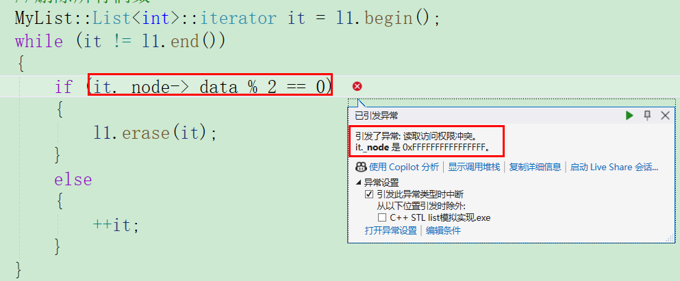 我们会发现当 l1 拷贝构造 l2 时程序报错了,原因在前面的学习其实已经讲过很多次了,就是因为链表的结点是 new 动态开辟出来的,所以拷贝构造需要进行深拷贝,否则拷贝构造后两者处于同一块空间,就会对同一块空间析构两次,所以解决方法就是手动实现拷贝构造函数。