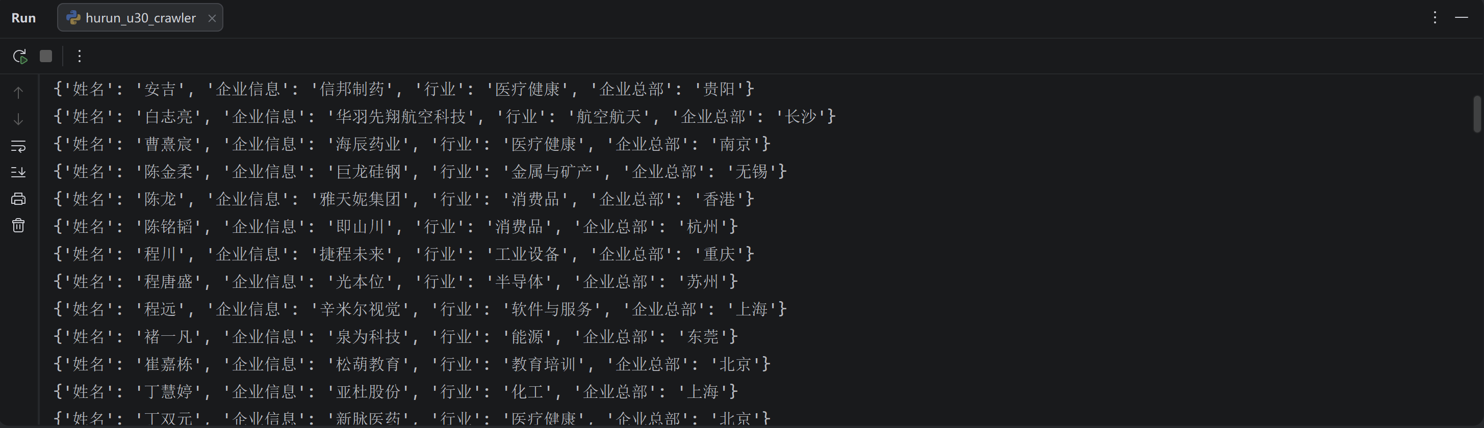 代码实现批量爬取胡润U30创业先锋榜榜单数据,整理结构化信息后存放到 Excel 文件中,包含姓名、企业信息、行业、企业总部等核心字段: