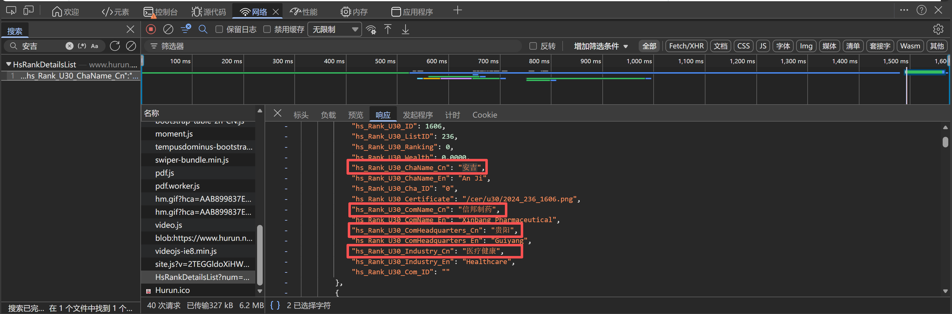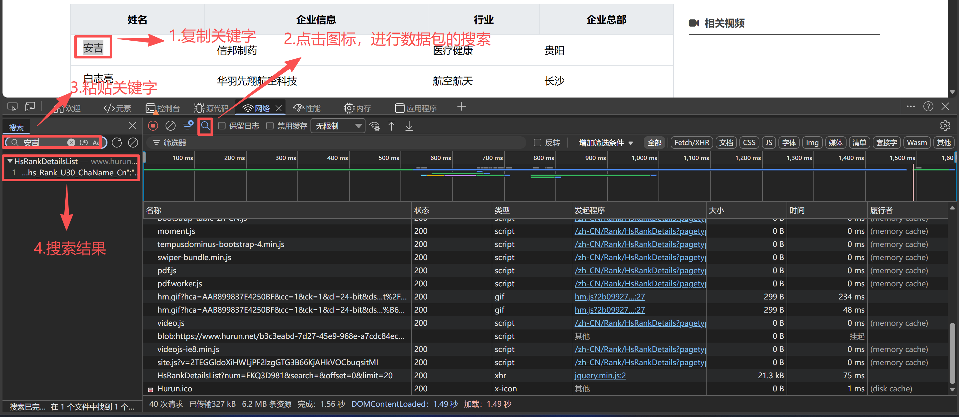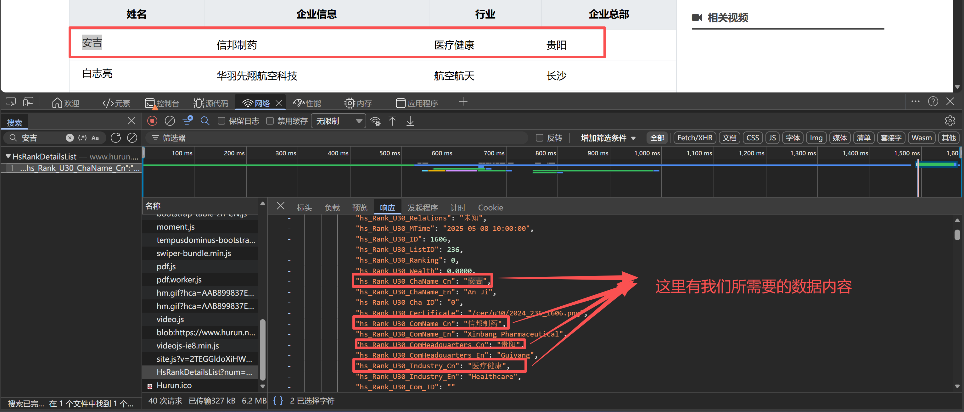 - Network(网络)中就是最新的抓包记录,可找到创业者信息相关数据: