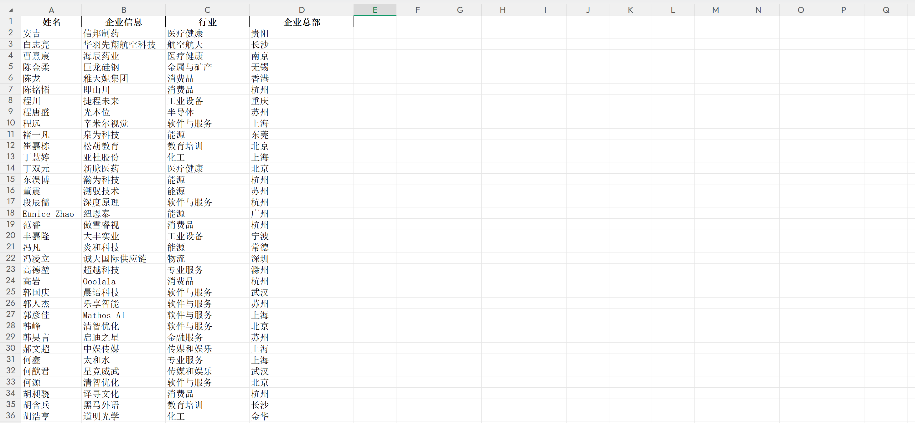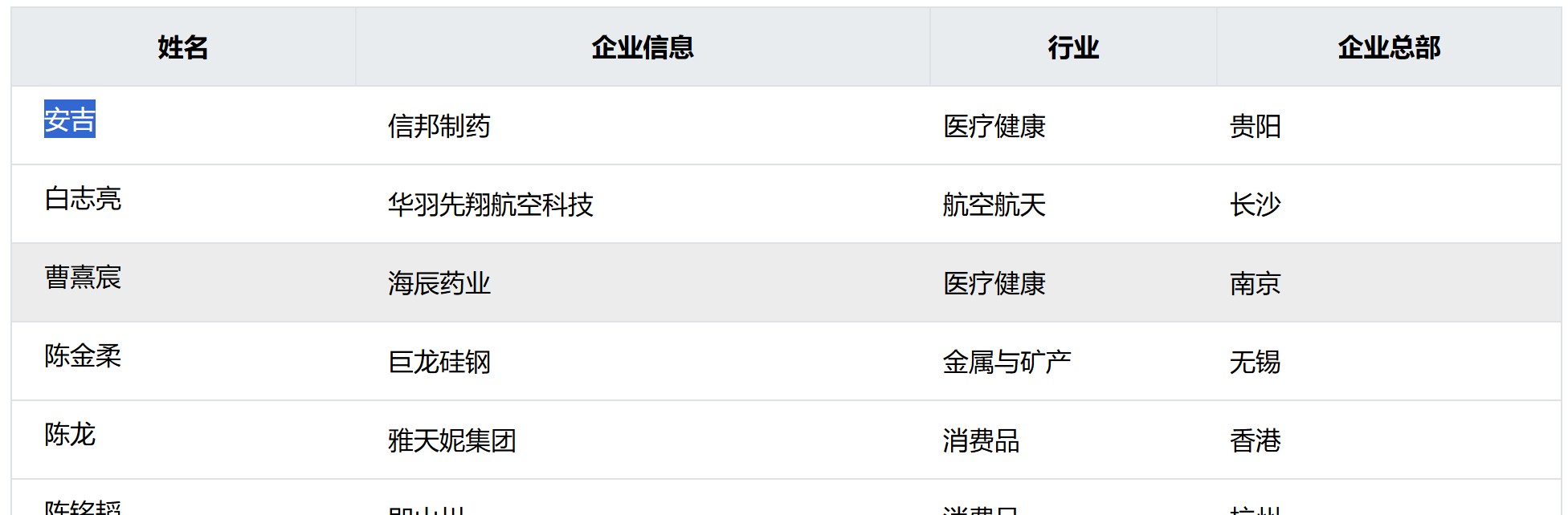 - 每条记录包含人物信息(姓名)和企业信息(企业名称、行业、总部等);