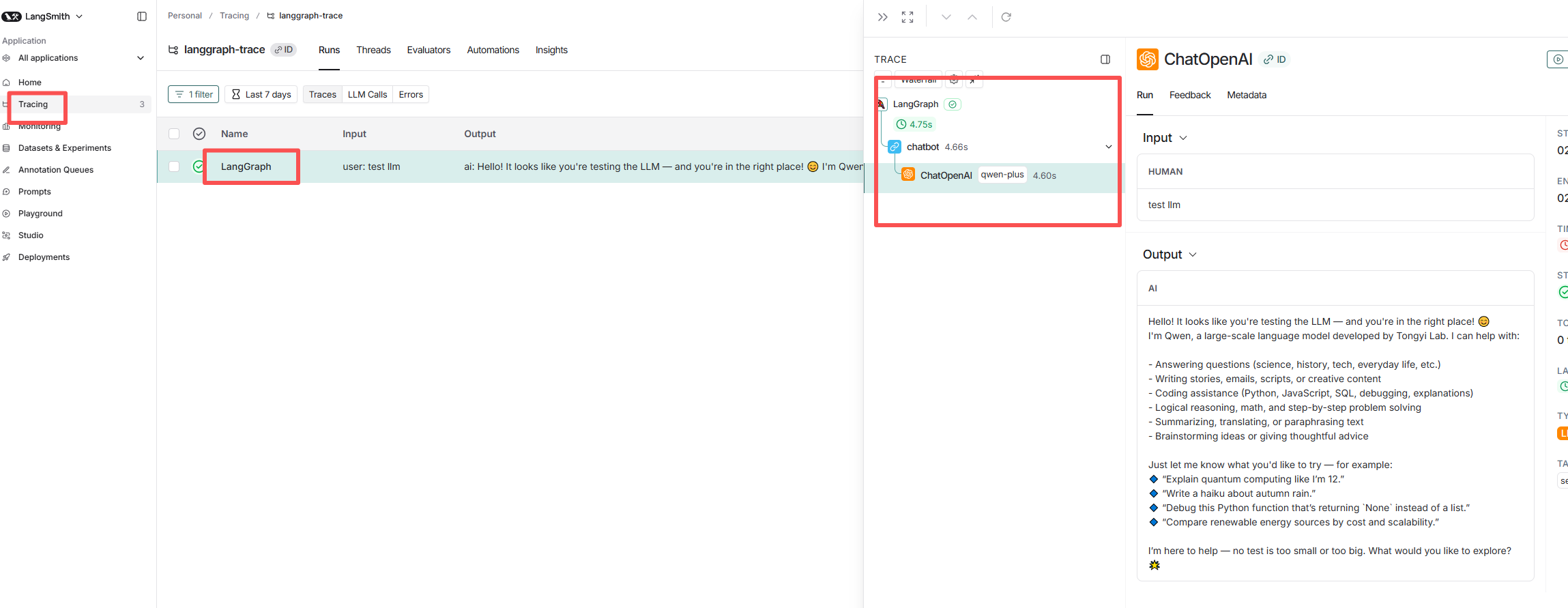 LangSmith Workspace 下会自动出现一个新的 Project:my_test_123,所有 trace 都进这个 Project