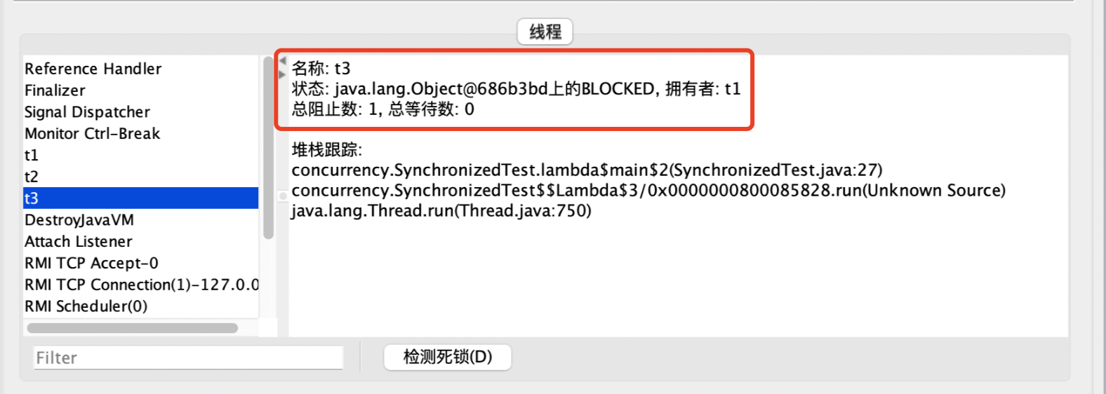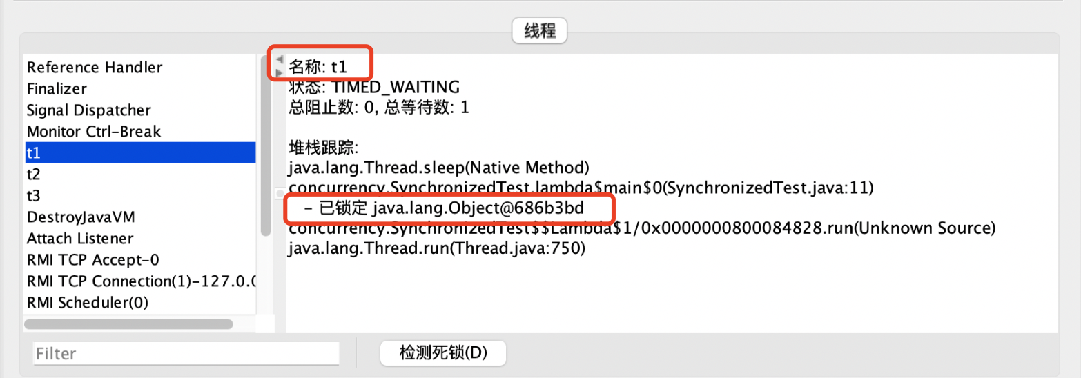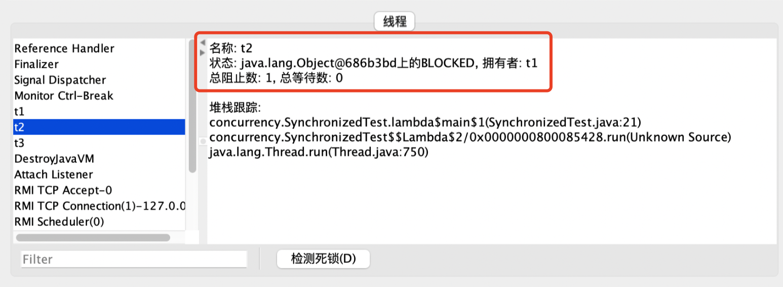 - 使用jconsole命令查看t1、t2、t3线程的执行情况,可以看到t1线程获取到对象锁,t2和t3线程在等待锁而进入BLOCKED状态
