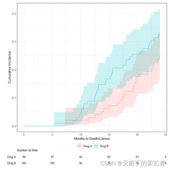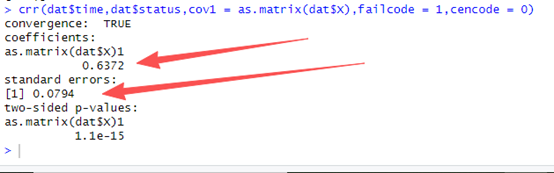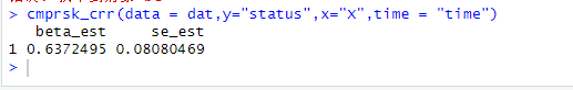 咱们可以看到系数是0.637,标准误是0.08,接下来咱们使用cmprsk包来分析一下