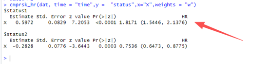 cmprsk_hr(dat, time = "time",y = "status",x="X",weights = "w")