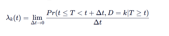 公式有两个大小t, T表示观察到的事件发生时间,t是咱们的时间,.表示在时间 t 时,在尚未发生任何事件的条件下,单位时间内发生第 k 类事件的瞬时风险。