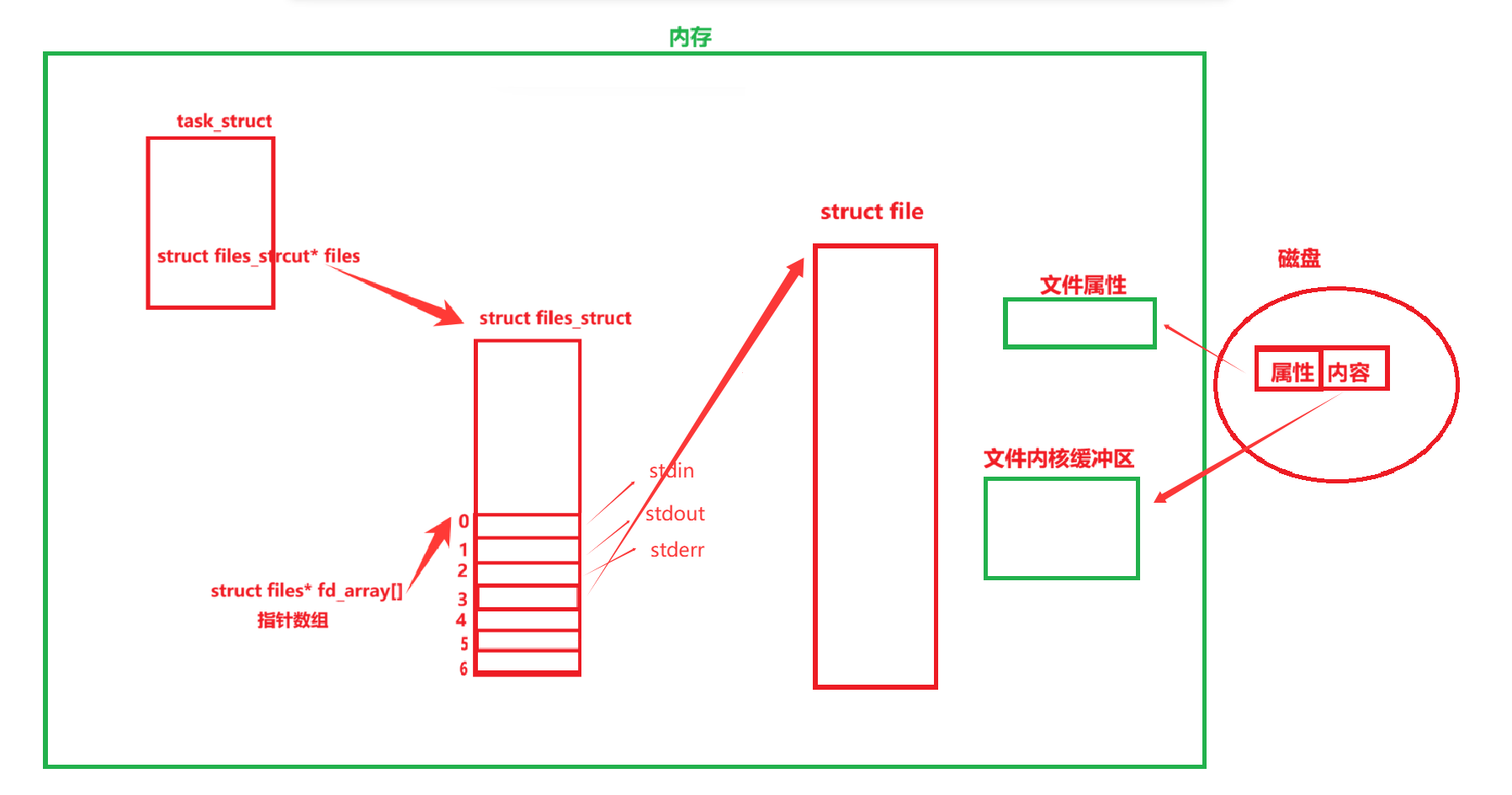 所以对于open函数,进程有task_struct、默认打开stdin、stdout、stderr,有files_struct,当使用open函数时,打开文件,并在files_struct指针数组中保存文件地址,file结构中能直接或间接找到文件属性和文件内核缓冲区中的文件内容。