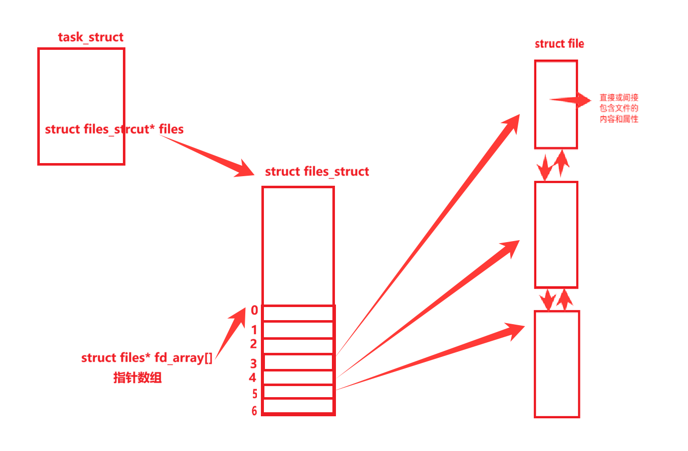 struct files_struct结构(文件描述符表 ),该结构中有一个struct file* fd_array[]数组,保存着文件结构
