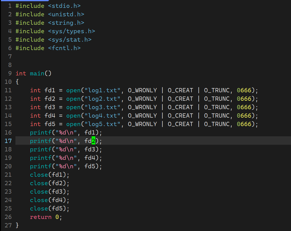 int fd = open("log.txt", O_WRONLY | O_CREAT | O_TRUNC, 0666);