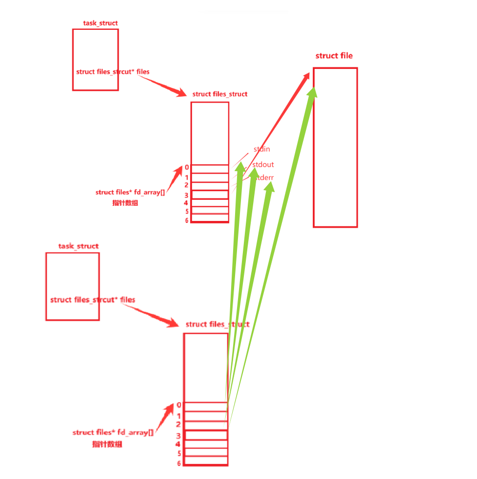- 子进程的文件描述符表中保存着父进程打开的文件,并不需要再拷贝一份新的父进程打开的文件,因为只有创建一个新的文件才需要创建struct file结构