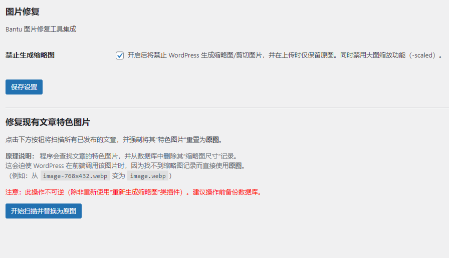 操作不可逆:使用"修复现有图片"功能会修改数据库中的图片元数据(删除 sizes 信息)。如果不满意结果,您可能需要使用"重新生成缩略图(Regenerate Thumbnails)"类插件来恢复。