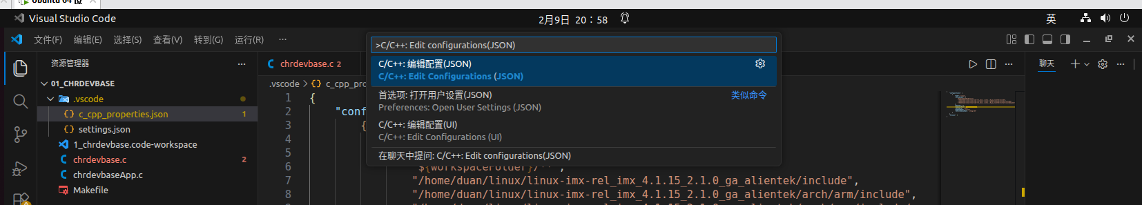编写 Linux 驱动时,一般会用到 Linux 源码中的函数。我们需要在 VSCode 中添加 Linux源码中的头文件路径。打开 VSCode,按键盘如下命令: