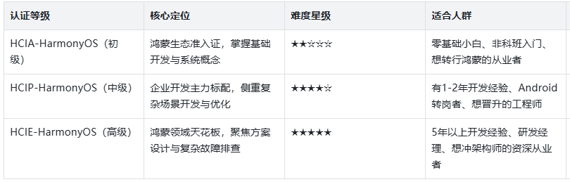 很多人问"好考吗",其实是没分清鸿蒙认证的等级------和华为HCIA/HCIP/HCIE体系一致,鸿蒙认证也分3个层级,从入门到专家,难度逐级提升。