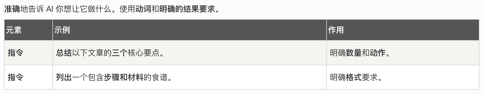| 任务与指令 | Insight & Statement | 清晰、具体地说明你要 AI 完成什么任务。这是提示词的核心。 | 请解释 列表推导式 的概念,并给出三个由易到难的例子。 |