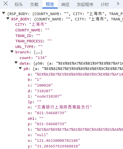 获取数据标签如下:n(网点名称)、a(地址)、o(联系电话)、c(联行号)、d(行政区划代码)、t(营业时间)、bsnTime(营业时间)、lat&lon(地理坐标),其他一些非关键标签,这里省略;