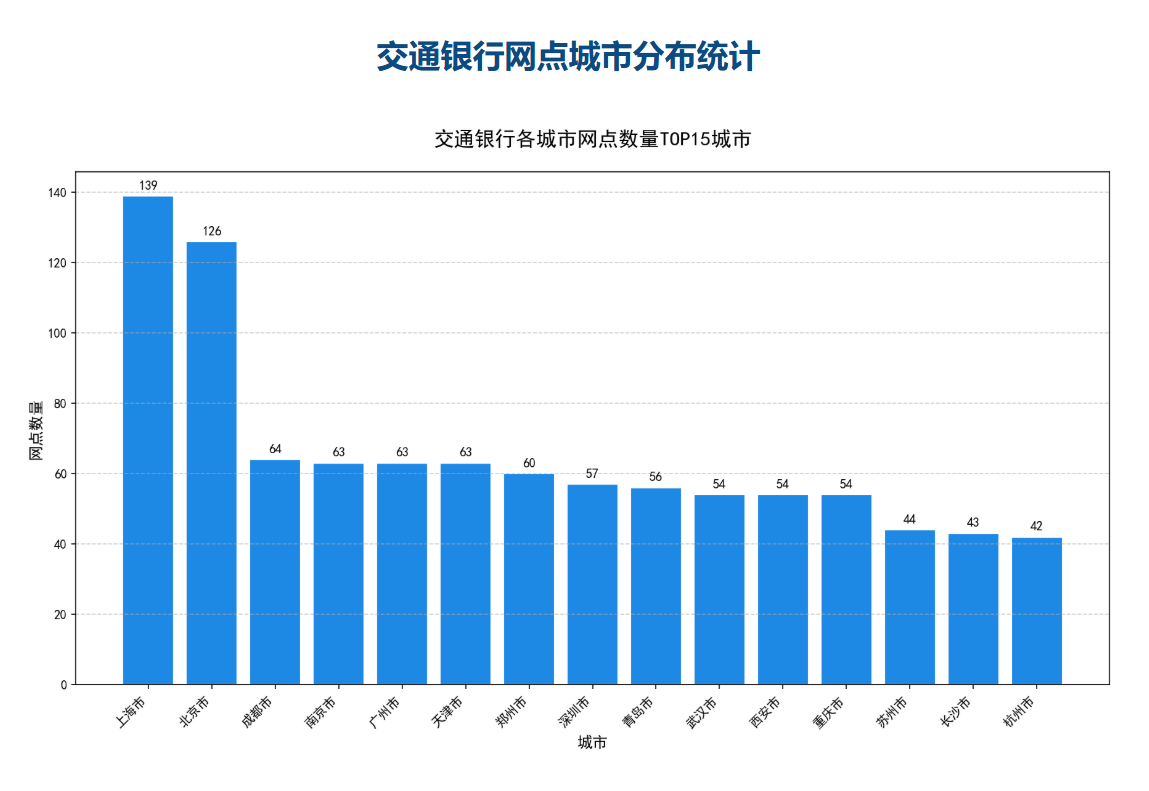 根据交通银行各城市网点数量TOP15分布图,其布局呈现出高度集中于东部沿海经济核心城市、以直辖市和省会城市为绝对主导 的特征。上海市以139家网点遥遥领先 ,作为交行总部所在地,不仅是全国金融中心,也是其最密集的服务腹地;北京市以126家紧随其后 ,依托首都政治与经济双重地位,形成强大的业务集聚效应。成都(64家)、南京(63家)、广州(63家)、天津(63家)等城市构成第二梯队,反映出交行在长三角、珠三角及中西部中心城市的战略投入。整体来看,前五名城市合计占比超过全国总量的40%,显示出其"强中心、弱边缘"的渠道策略。