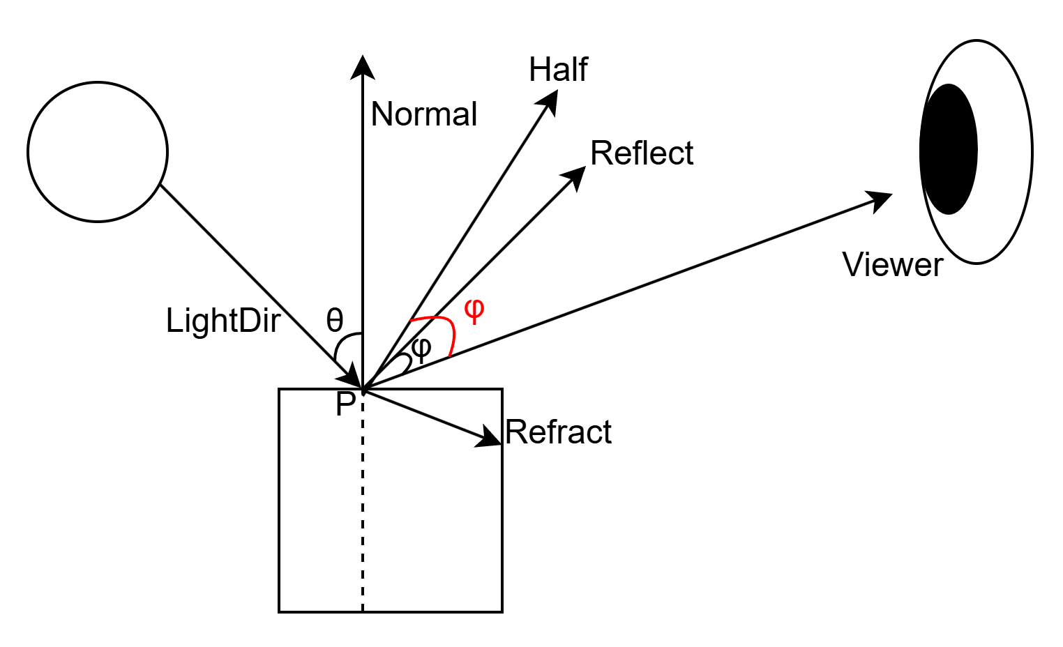 L = normalize(LightPos - P)V:视线方向(从点P指向相机/眼睛ViewPos,图中右上)