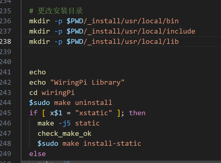 2.1 修改build.sh脚本,在echo "WiringPi Library" 之前添加: