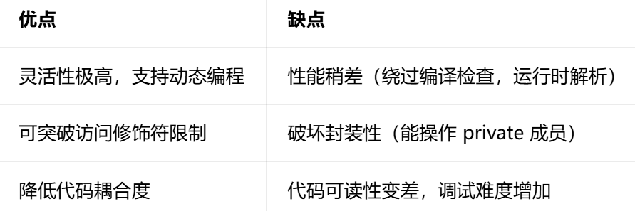 3.核心价值:是框架的基础,实现"动态编程",但日常开发中应尽量少用(避免性能和封装性问题)。