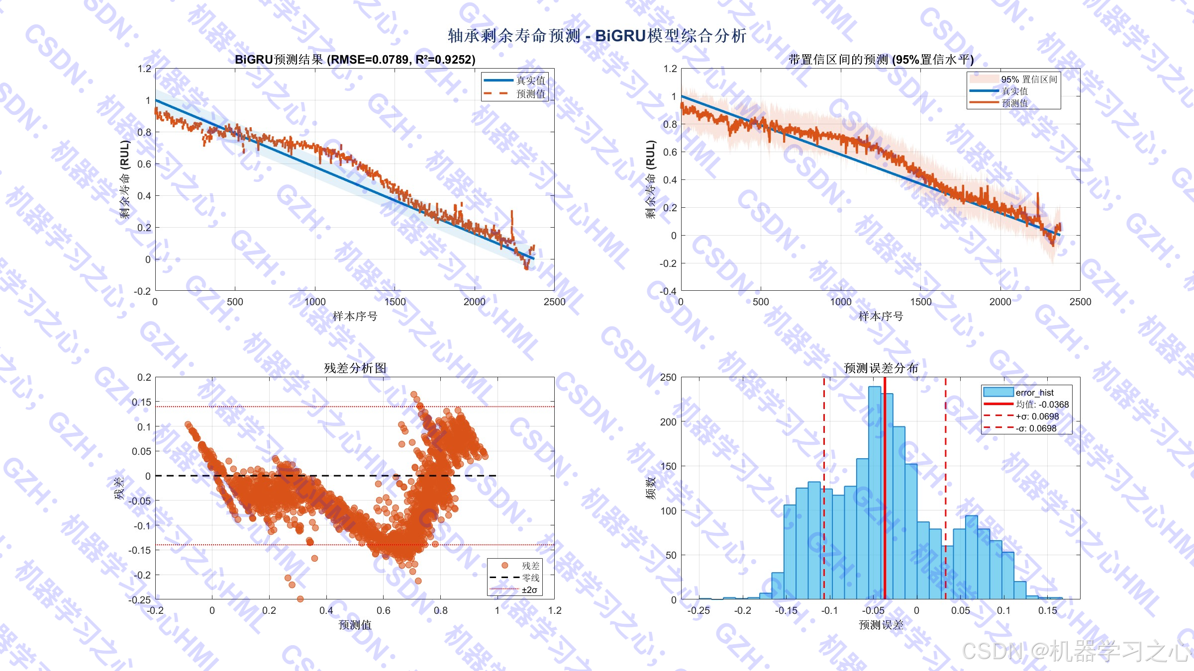 振动信号 → 特征提取 → 特征重构 → 数据标准化 → BiGRU建模 → 预测输出 → 可视化分析