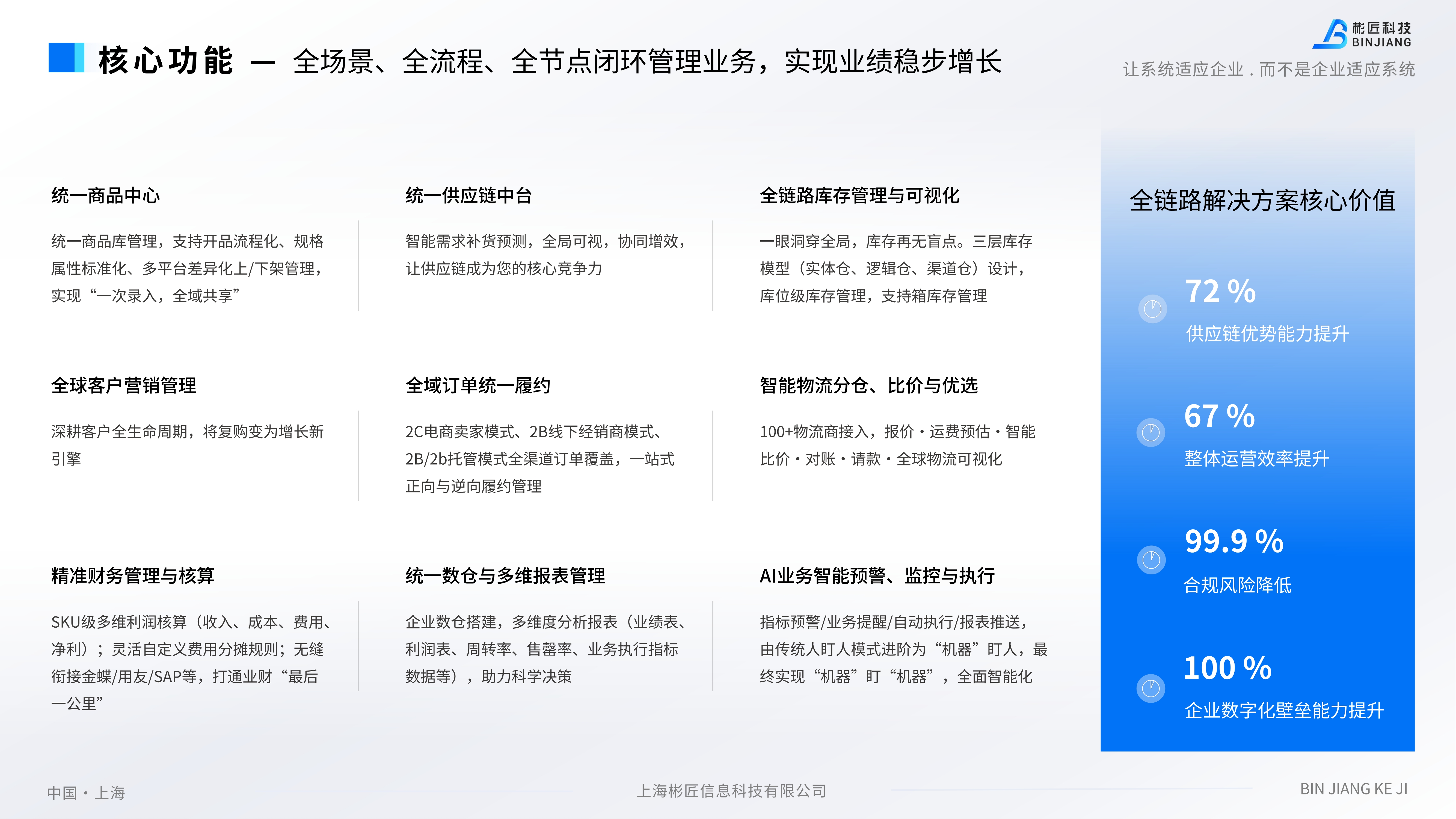| 该国核心痛点 | 彬匠ERP该国解决方案 | 该国量化价值 | 本地平台适配 |