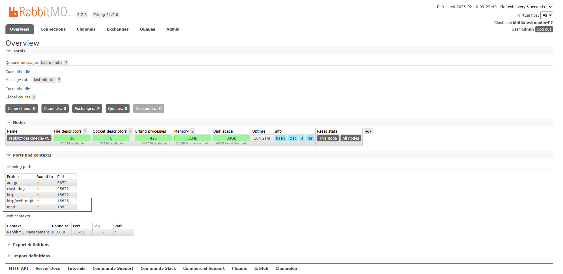 如果插件启动成功,rabbitmq会打开1883和15675端口: