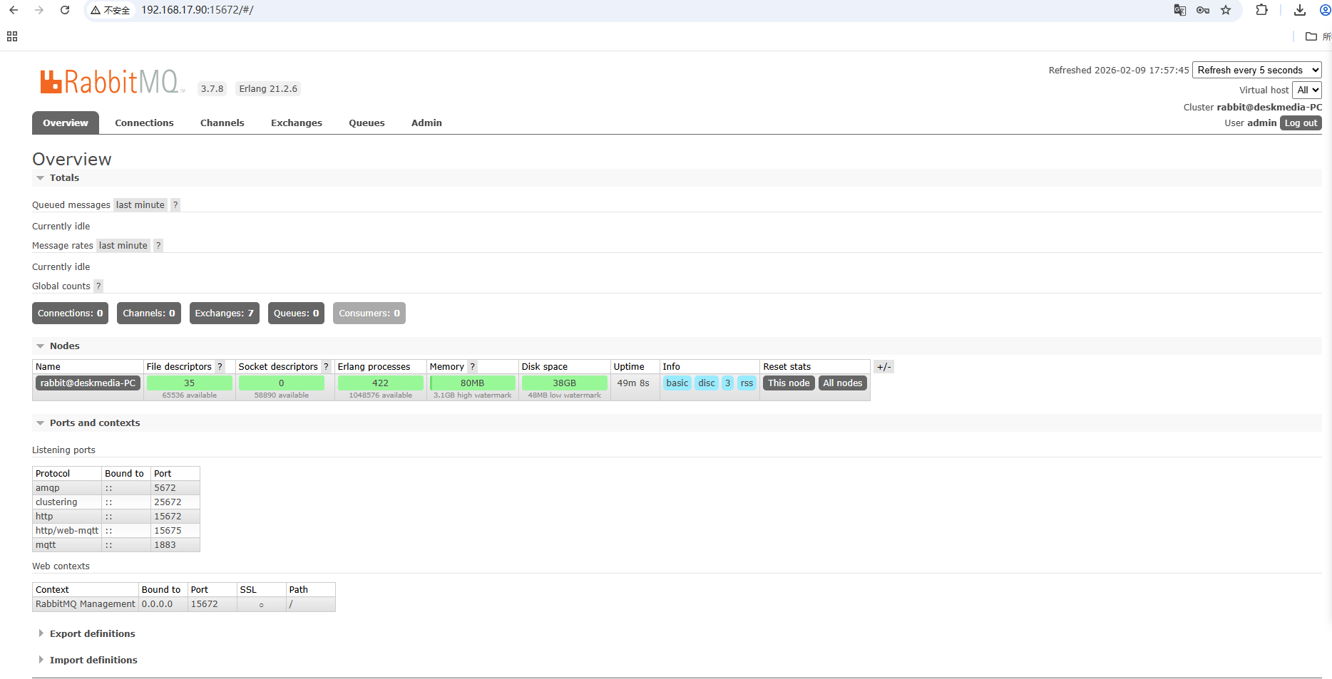 默认管理端口为 15672。在浏览器访问: