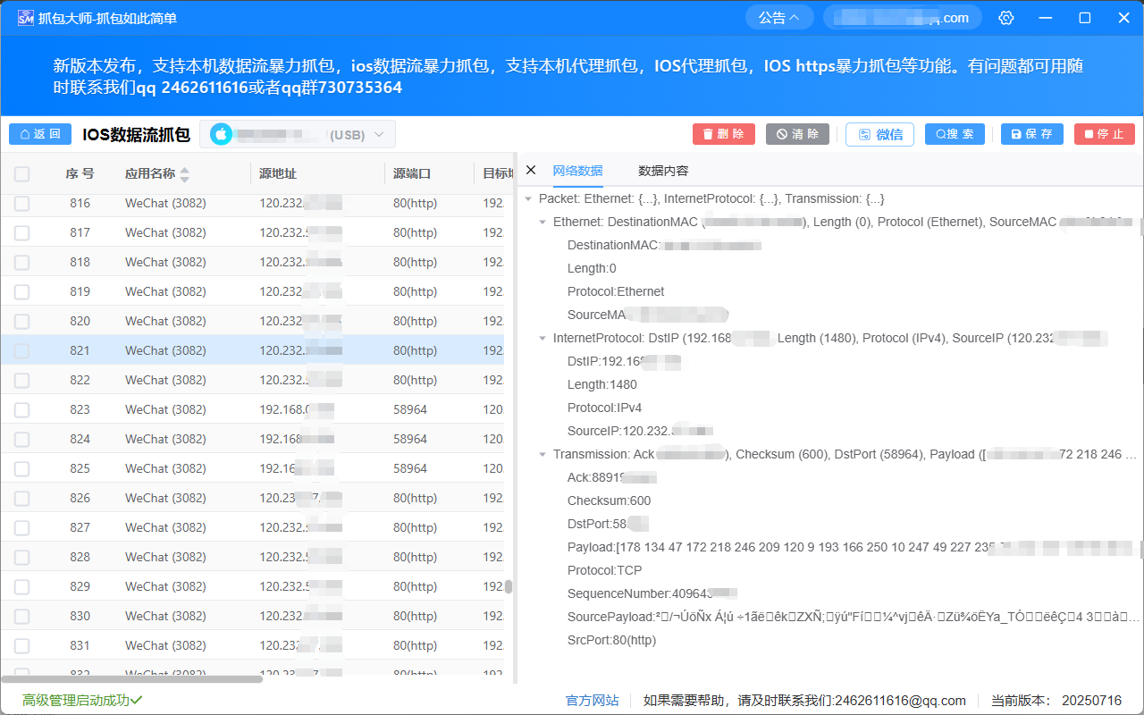 抓包大师支持通过 USB 在 Windows 上直接抓取 iOS 设备的网络数据。