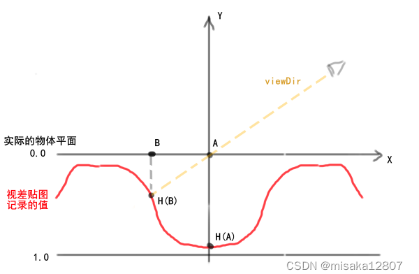 在一般采样物体表面的时候,A点是平时所采样的点,但在现实中H(B)这个地点才是人眼所看到的位置,B点才是符合现实情况的采样点。AB这段距离就是需要修正值。