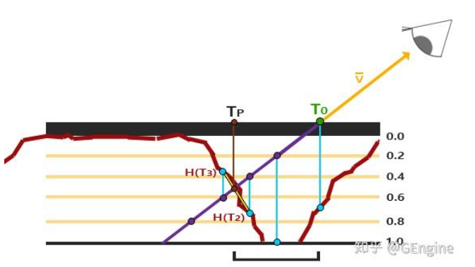 视差遮蔽映射中,H(T3)是当前采样的点,Tp是理想中我们采样的点,H(T2)是上一个不符合条件的采样点,虽然不符合条件,但是它已经相当逼近理想点了,理想点就在H(T3)和H(T2)之间,所以我们需要一个权重,告诉我们实际的采样坐标应该是往H(T3)靠近还是往H(T2)靠近。具体算法如下: