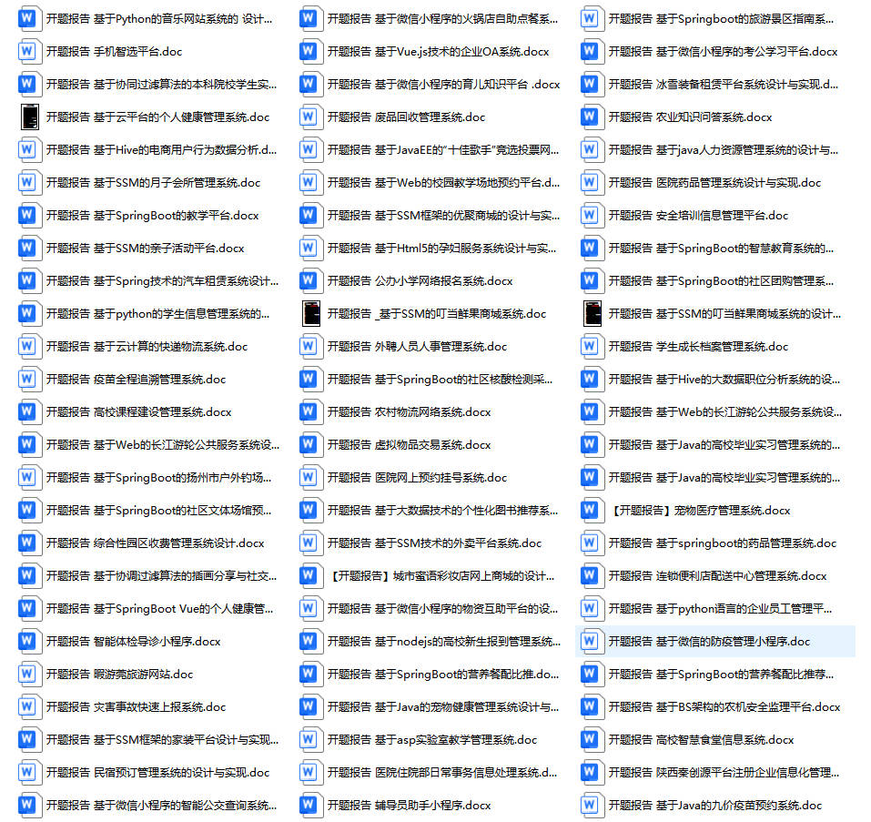 以上是某同学的毕业设计答辩的过程,如果你现在还没有参加答辩,还是开题阶段,已经选好了题目不知道怎么写开题报告,可以下面找找有没有自己符合自己题目的开题报告内容,列表中的开题报告都是往届真实的开题报告,可发送使用或参考。文末或底部来联xi可免费获取