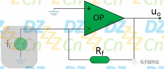 我们也可以用反相放大器来组成I-V电路,如下图所示,反相端一方面与输入电流源ii连接,另一方面通过反馈电阻Rf与输出连接形成负反馈电路。