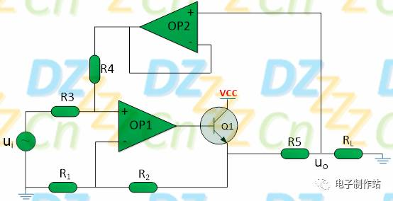 这样流过负载RL的电流不再由运放直接提供,而是由三极管将运放输出放大后的电流来提供,如果需要更大的电流,也可以使用达林顿管(复合管)或场效应管来代替三极管Q1