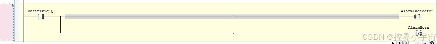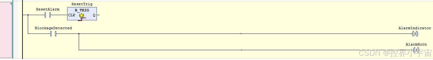 - 报警状态通过SET指令锁定,仅在复位按钮的上升沿(ResetTrig.Q)触发RESET指令清除,保证报警不会自动消失;